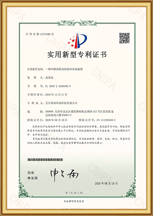 • 實(shí)用新型專利證書(一種甲醛清除劑的原料存儲(chǔ)