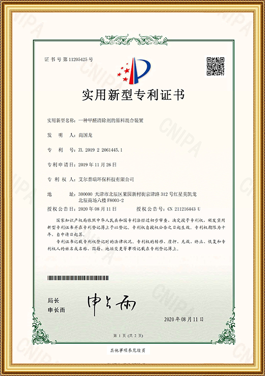• 實(shí)用新型專利證書(一種甲醛清除劑的原料混合